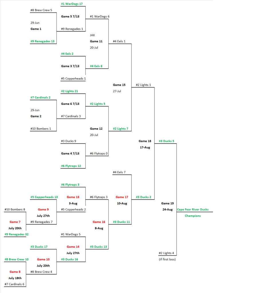 8/17 – “GAME 18”TBDTBD#3 River Ducks2#2 Northern Lights1
