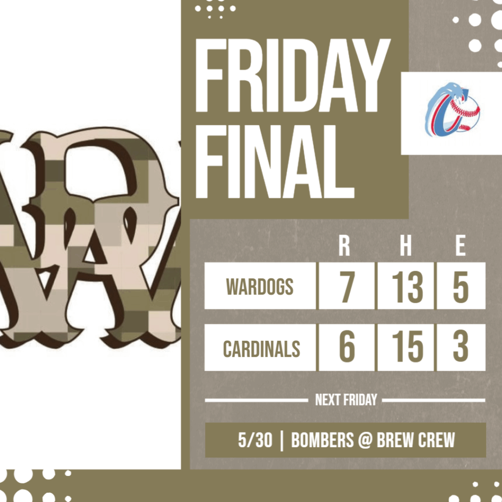 An extra-innings thriller! After a 5-run 4th by the WarDogs and a late rally by the Cardinals, Sergei Swart’s walk-off double sealed it. JJ Tipton and Jeff Wilson powered the WarDog offense, while James Bowker pitched five clutch innings of relief. The Cardinals’ 15-hit effort fell just short.